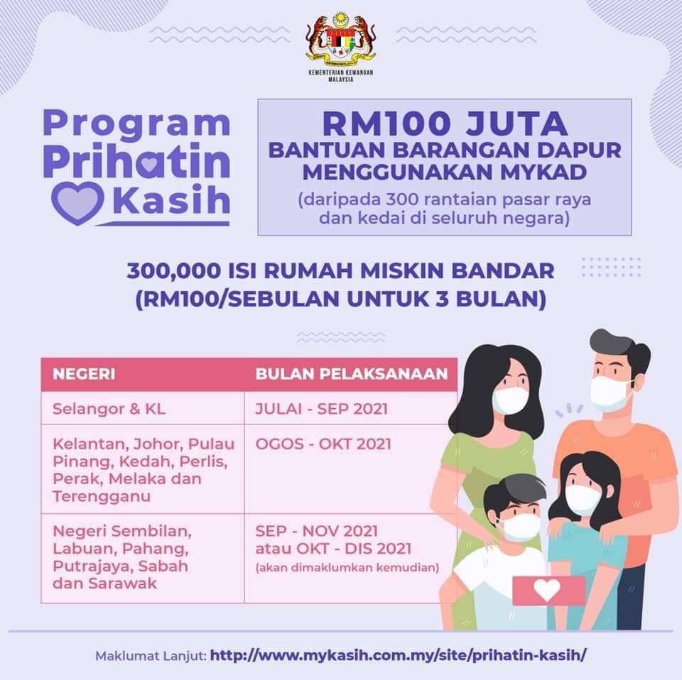 根据大马财务部所发出的文告显示,政府推出Program Prihatin Kasih 计划派发,补贴金给贫穷家庭购买日常用品及食品!符合资格者将可获得RM100的关怀补助金,持续3个月共可获得RM300 补贴金!