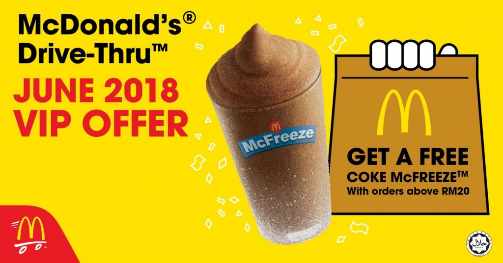 麦当劳6月免费送Frozen Coke 3 Jun , 2018 | 吃喝玩乐 著名快餐品牌麦当劳又有东西要送给你啦!只要6月前往临近分店消费满RM20,即可免费获得Frozen Coke!好棒棒~ 这项促销仅限VIP Sticker车主,只要消费满RM20即可获得!没有VIP Sticker的消费者,也可以到麦当劳索取喔!赶紧约朋友一起去drive thru麦当劳吧! 分享
