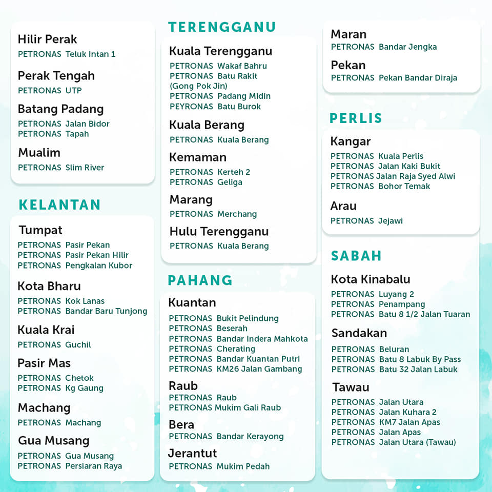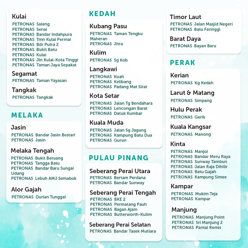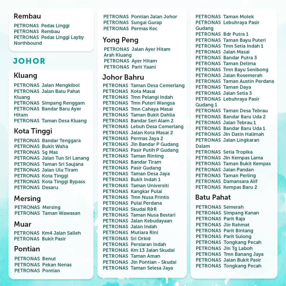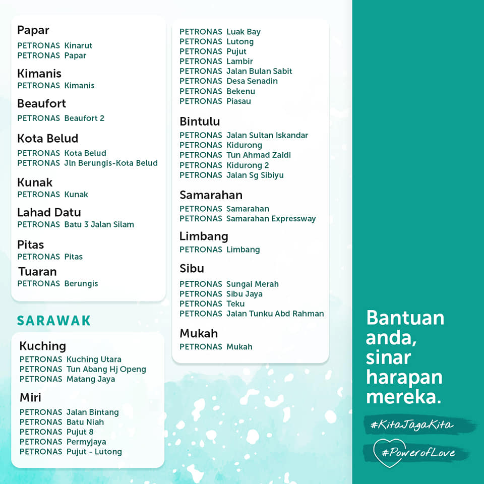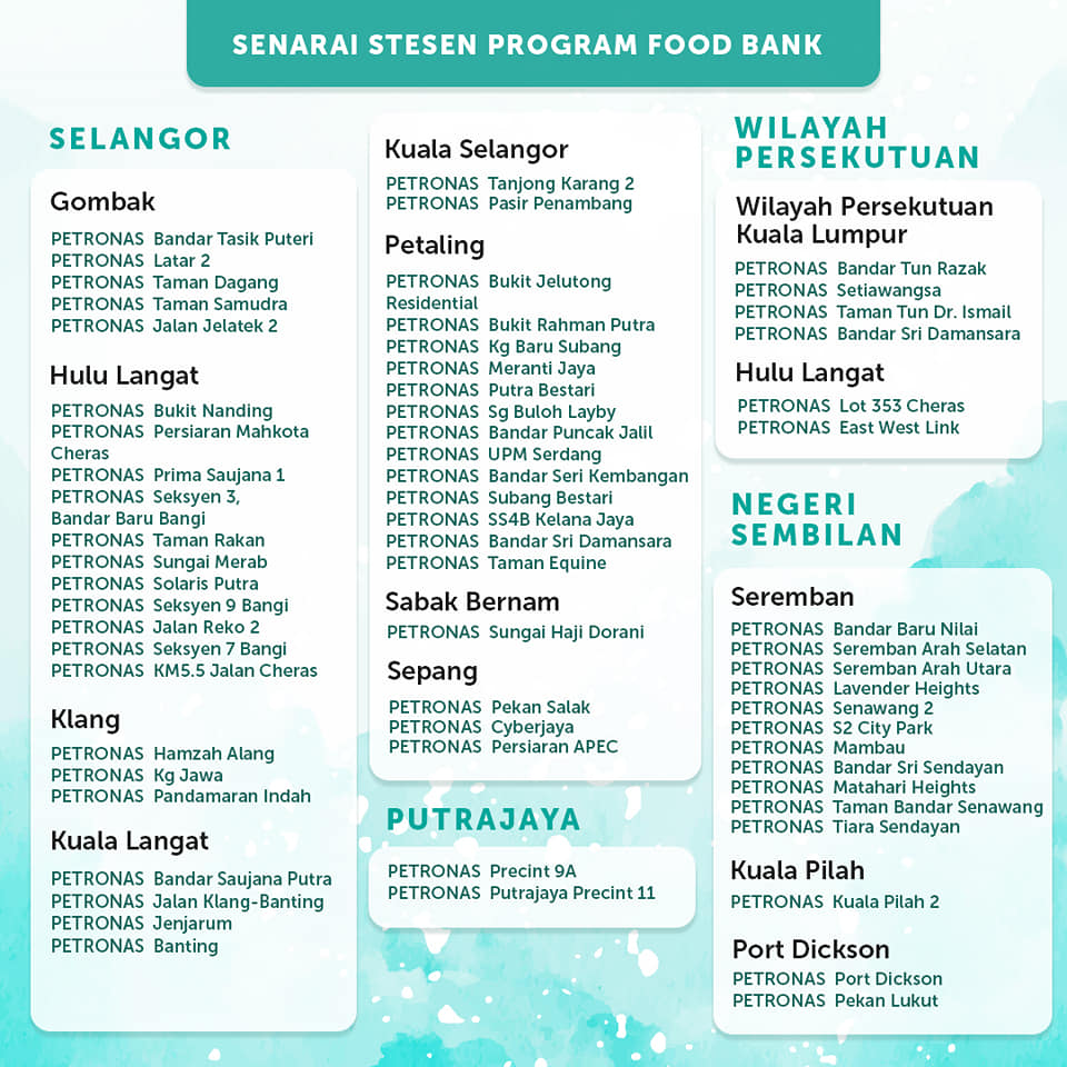 Petronas设立的食物银行供应了不少食品,包括白米、食盐、白糖、面粉、快熟面、沙丁鱼、米粉、鸡蛋、饼干和食用油等!如果,你正面临经济压力,家中缺乏粮食,可以前往以下油站领取食物!有能力的朋友,也可以为这些食物银行提供食物哦!