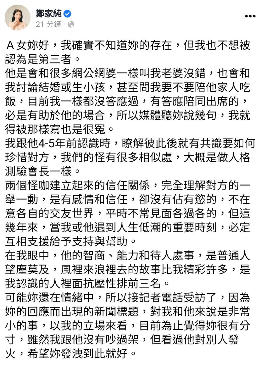 鸡排妹也说,在她眼中,对方的智商、能力和待人处事,是普通人望尘莫及,“风里来浪里去的故事比我精彩许多,是我认识的人里面抗压性排前三名。”她最后向A女喊话:“可能你还在情绪中,所以接记者电话受访了,因为你的回应而出现的新闻标题,对我和他来说是非常小的事,以我的立场来看,目前为止觉得你很有分寸,虽然我跟他没有吵过架,但看过他对别人发火,希望你发泄到此就好。”
