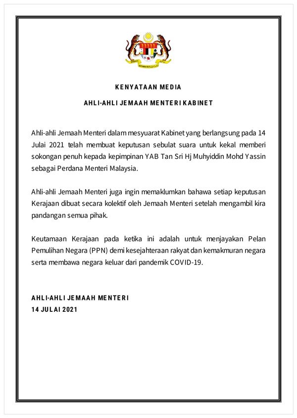 内阁支持慕尤丁 14 Jul , 2021 | 民生关注 内阁一致表态,支持慕尤丁为首相。 内阁发文告,表示一致决定继续支持慕尤丁,并强调政府所做任何决定,都是听取各造意见后的内阁集体决定。 内阁还重申,当前首要任务是为了人民和国家福祉,确保成功落实国家复苏计划,让国家走出新冠肺炎大流行。 “内阁是在今日的会议上,作出上述决定。” 分享