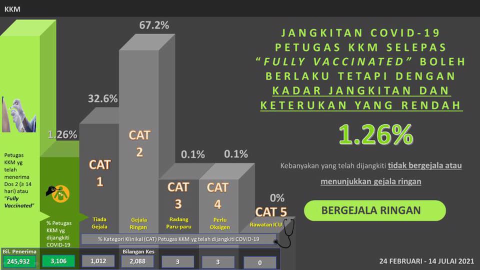 1.26%医护接种后受感染 16 Jul , 2021 | 民生关注, 民生百事 我国24万5932名完成接种的医护人员,当中3106人仍受感染,但仅占接种人数的1.26%。 完成接种疫苗的定义是接种了第二剂疫苗,及过了14天以上者。 而且绝大部分受感染的医护,只处于第一无症状或第二轻微症状的阶段。 卫生部发布今年2月24日至7月14日的数据,受感染的医护人员,只有三人处于肺部受侵袭的第三阶段,另三人处于需要供氧的第四阶段。无人需要进入ICU治疗。 在3106名受感染的医护中,大部分者或2088人是出现轻微症状。1012人是无症状。 以上数据证明,接种疫苗确实能挽救生命! 分享