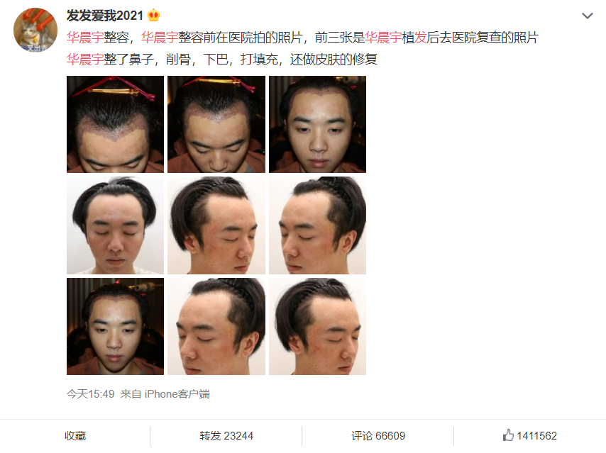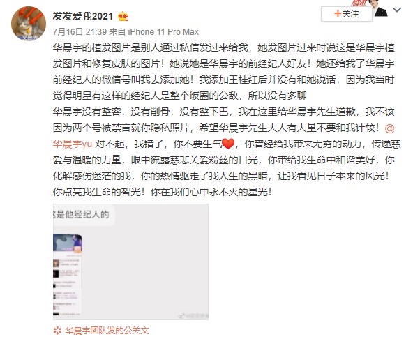 爆料网友在微博发文道歉:“华晨宇没有整容,没有削骨,没有整下巴,我在这里给华晨宇先生道歉,我不该因为两个号被禁言就你隐私照片,希望华晨宇先生大人有大量不要和我计较!”