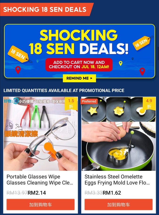 不同的时段会有不同的好康及优惠劵送出,最低只需RM0.18 就能买到,惊呆了吧?