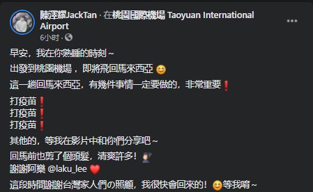 台湾工作半年 陈泽耀回马打疫苗 18 Jul , 2021 | 娱乐前线 【特别报道】“阿哲”陈泽耀从去年12月开始飞到台湾工作,时隔半年终于回马啦! 阿哲今日在面子书上晒出戴着面罩自拍:“早安,我在你熟睡的时刻~出发到桃园机场 ,即将飞回马来西亚 😊这一趟回马来西亚,有几件事情一定要做的,非常重要❗️打疫苗❗️打疫苗❗️打疫苗❗️其他的,等我在影片中和你们分享吧~” 另外,他也透露在回马之前还不忘在台湾剪头发,应该是知道回马后暂时无法修理头发吧!而底下也有许多粉丝为此而感到开心纷纷留言”欢迎回马“,还有粉丝贴心叮咛要记得做好防护。 分享
