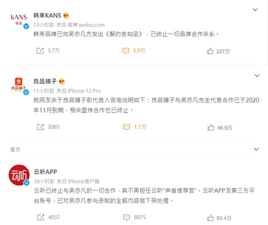 据了解,他先前代言的中国化妆品牌“韩束KANS”已在18日发表声明,表示:“已向吴亦凡方发出《解约告知函》并终止一切品牌合作关系”;随后“良品铺子”也发文宣布,称和吴亦凡的合作已在2020年11月到期,“云听”方面则表示,已将吴亦凡参与录制的全部内容下架,而今(19日)代言品牌“立白”也在微博发表声明,宣布终止与吴亦凡的合作关系。
