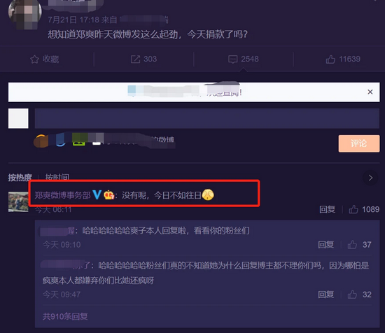 网友质疑没有捐款 郑爽回复:今日不如往日 23 Jul , 2021 | 娱乐前线 有网友发微博质疑郑爽没有捐款:“发微博这么起劲,今天捐款了吗?”而郑爽直接回应该名网友,并承认没有捐款:“没有呢,今日不如往日。” 据悉,郑爽微博事务部的微博一直以来都在更新郑爽这段时间的动态,包括合约、经济合同被相关部门审核,自己接受警察调查等事件。7月19日,郑爽发长文为代孕一事道歉,表示她没有1.6亿片酬,没有日薪208万。7月20日,张恒发长文以及多张聊天记录截图致郑爽,否认对郑爽的持续骚扰,再一次将郑爽弃养代孕婴儿、剧组现场对导演和剧组人员不尊重、同居期间和前男友接吻等事件详细描述。 分享