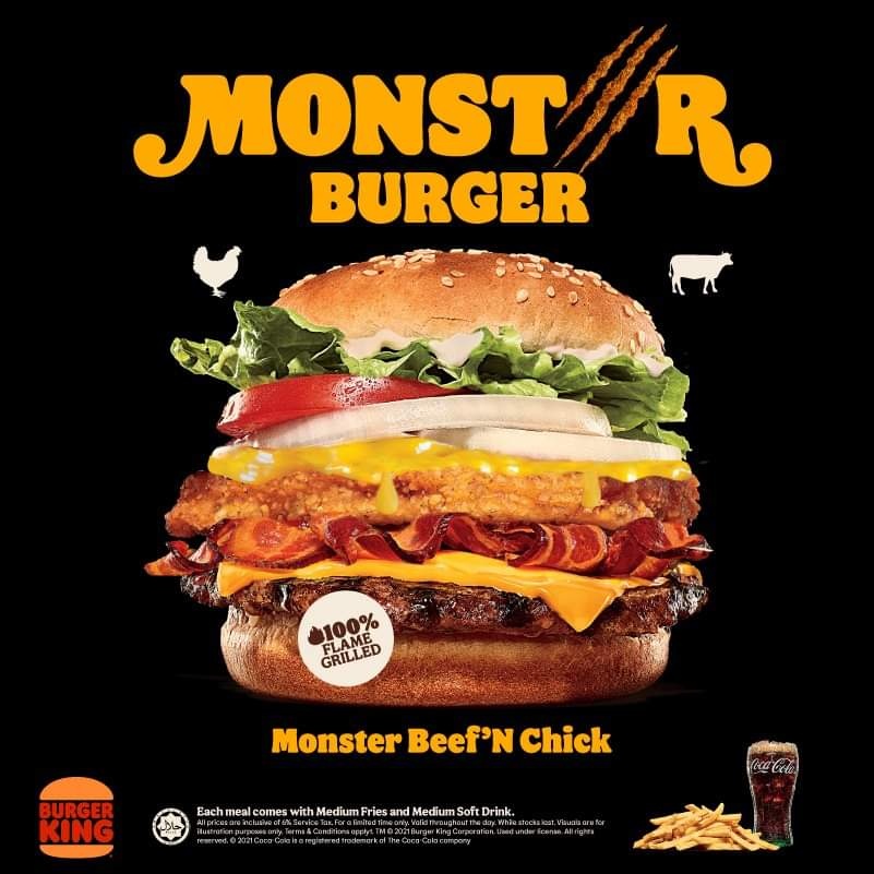 如果,你不喜欢吃牛肉,那也可以选择另一款 Monster Fish’N Chick!这款汉堡结合鱼肉饼和鸡肉饼,同样配上各种芝士、番茄、蔬菜,为所有的食客带来双重的滋味!想要尝鲜的朋友,赶快到临近的Burger King分店购买咯!