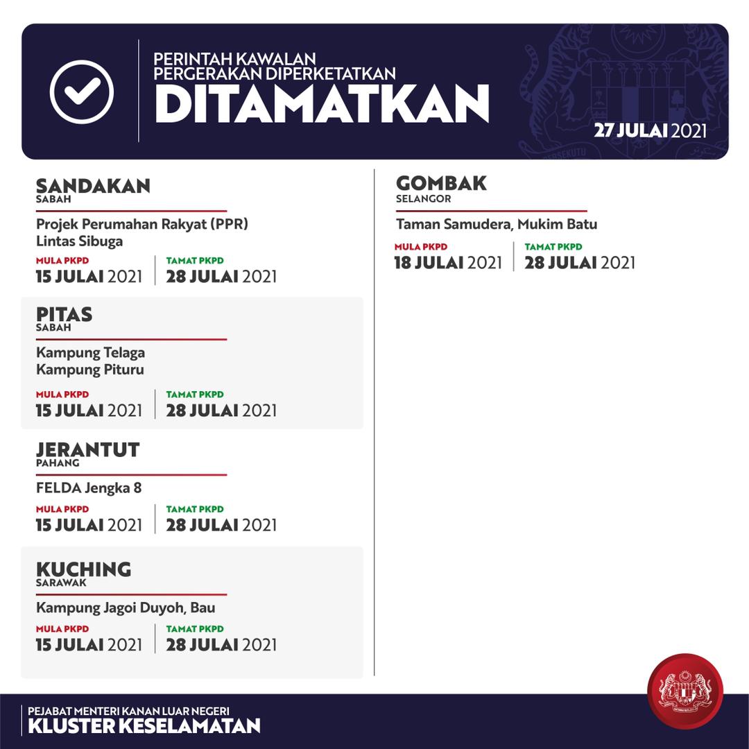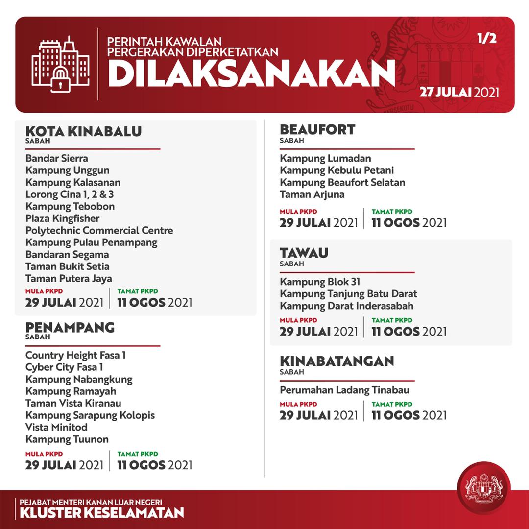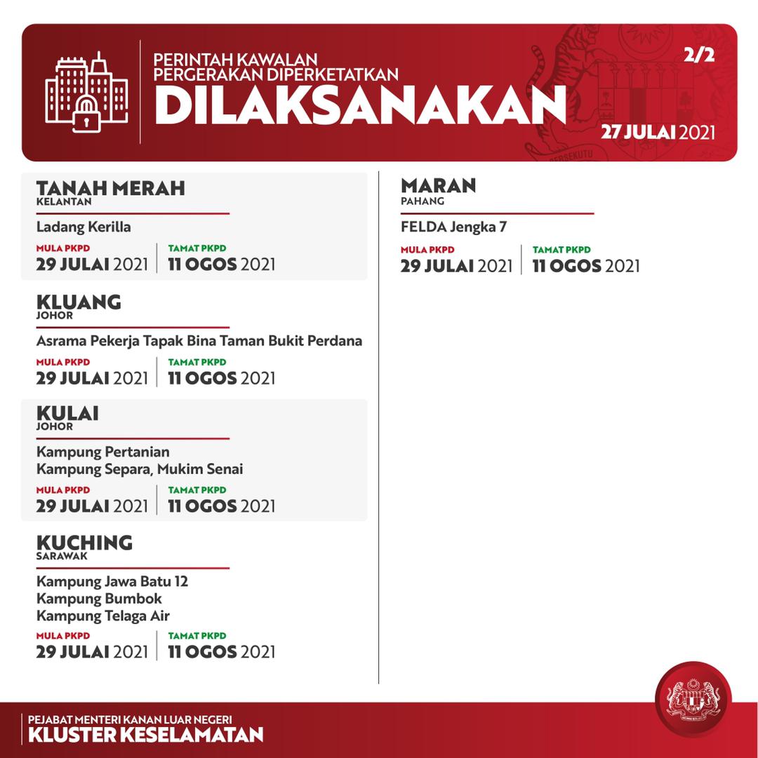 沙砂丹柔彭34点明起EMCO 28 Jul , 2021 | 民生关注 (吉隆坡28日讯)政府决定从明日起至8月11日,在沙巴、吉兰丹、柔佛、砂拉越及彭亨共34地点,实施两个星期的加强行动管制令(EMCO)。 外交部高级部长拿督斯里希山慕丁说,这是在听取卫生部汇报,就评估有关风险后,所作出的决定。 以下为EMCO地区: 分享