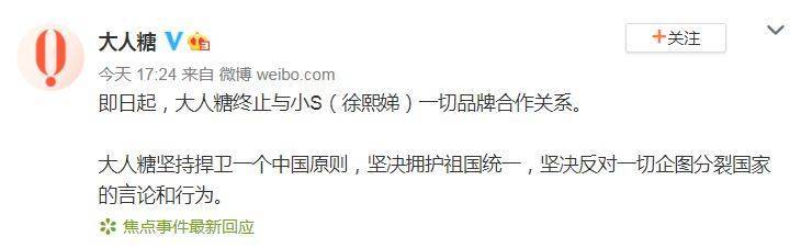 情趣用品品牌“大人糖”在6月才透过微博大动作宣布小S成为品牌代言人,今(2日)也发文表示:“即日起,大人糖终止与小S(徐熙娣)一切品牌合作关系。大人糖坚持捍卫一个中国原则,坚决拥护祖国统一,坚决反对一切企图分裂国家的言论和行为。”