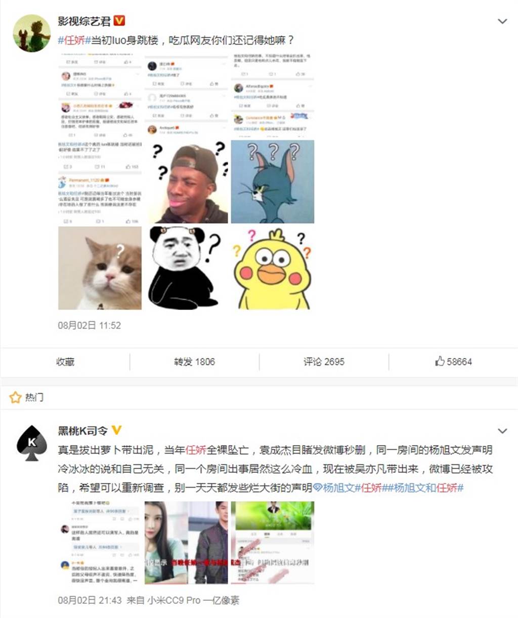 吴亦凡因遭网红都美竹指控私生活不检点,涉嫌诱奸未成年少女以及迷奸涉毒等多宗罪状后遭到警方刑拘,在吴亦凡遭警方带走两天后,任娇2017年全裸堕楼案件再次冲上微博热搜,而她生前最后见的男友演员杨旭文成为了嫌疑人,虽然工作人员说是因为忧郁症而导致想不开,但外界依然觉得疑点重重。
