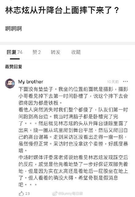 有网民参与《披荆斩棘的哥哥》录影,当天亲眼目睹林志炫跌落高达2公尺的舞台,当场听到摄影师惊吓喊出声,并透露台下并没有软垫等保护措施,而是一块坚硬的铁板,而林志炫的队友发现他跌落后,火速冲到他身边关心,随后他仍保持敬业态度,一瘸一拐地回到舞台上谢幕。