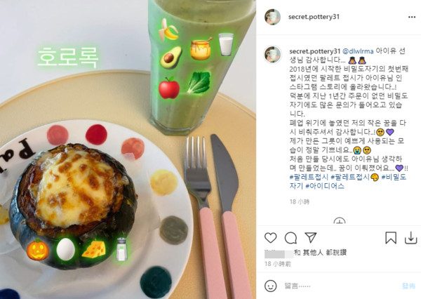 粉丝搜寻后发现该盘子是来自一个网路小店,追随偶像的脚步也跟著订购,店主又惊又喜地表示:“IU大人真的很感谢你,2018年开始的秘密陶瓷第一个盘子‘Palette’在IU的IG限时动态出现了,托你的福过去1年都没有订单的秘密陶瓷收到了很多购买谘询,谢谢你再次照亮我濒临停业的小小梦想,我做的陶器被这么漂亮地使用真的好开心,制作当时其实也是想著IU做的……我的梦想实现了。”字里行间满溢著感谢之情。
