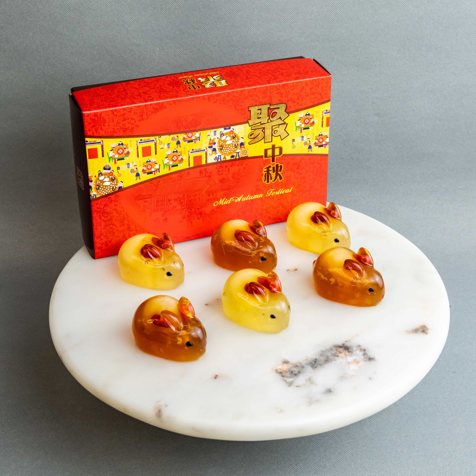 如果您觉得烤皮月饼的糖份和卡路里太高,那么您可以看看这些可爱的兔子造型桂花果冻月饼。内嵌桂花、龙眼、枸杞使这些可爱的小兔子,色泽金黄。非常卡哇伊的造型,让小孩子都会忍不住爱上它们!