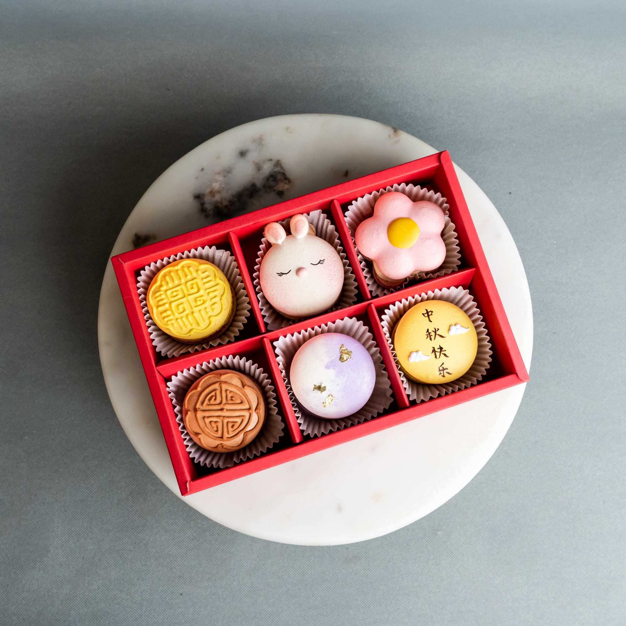 不妨来看看月饼造型的马卡龙,简直就是完美的2021年中秋节佳礼!传统月饼造型的高级法式甜点,而且还有2种口味让您选者:传统的红豆沙&莲蓉口味;或者如果您喜欢更清爽的口味,那么您可以选择柠檬白巧克力和黑巧克力口味。