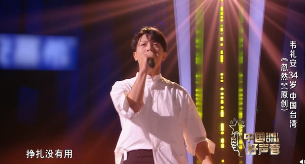 在最新一集的《中国好声音》里,韦礼安以选手身分,重回学员角色,在盲选环节中飘唱自己的自创新曲《忽然》,歌曲中不只蕴含饱满的情感,感动现场所有观众。