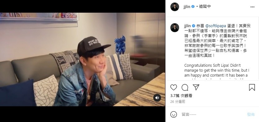 不仅如此,林俊杰还在影片底下发表了的感言,直言自己:“一点都不遗憾,能够应金曲奖大会邀请,参与《手牵手》的重制对我来说已经是最大的荣幸、最大的肯定了”,文末更感性地写下:“希望这个世界少一点自私和伤害,多一些温暖和真诚!”许多粉丝也纷纷留言为他加油打气。