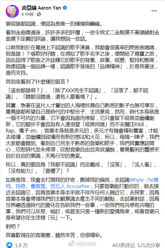 第32届金曲奖完美落幕,不过就有网友对于许多音乐人感到陌生纷纷在留意“谁啊?“”没听过“嘲讽,让炎亚纶发文回怼!