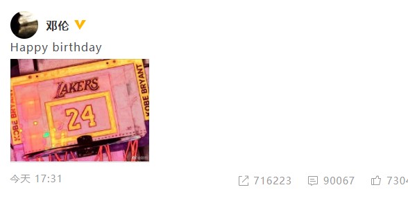 邓伦发文为已逝球星科比庆生 24 Aug , 2021 | 娱乐前线 邓伦在微博发文纪念已故球星科比,并晒出了印有代表着科比24号的篮板。 8月23日是洛杉矶湖人已逝球星科比·布莱恩特的43岁生日。邓伦在微博发文纪念:“Happy birthday !”并晒出了印有代表着科比24号的篮板。虽只有简单一句,但也看得出邓伦对科比的崇拜和怀念。 网友们看到后也纷纷留言评论:“他会知道的!你也要好好的。”“永远的24号,生日快乐!” 分享