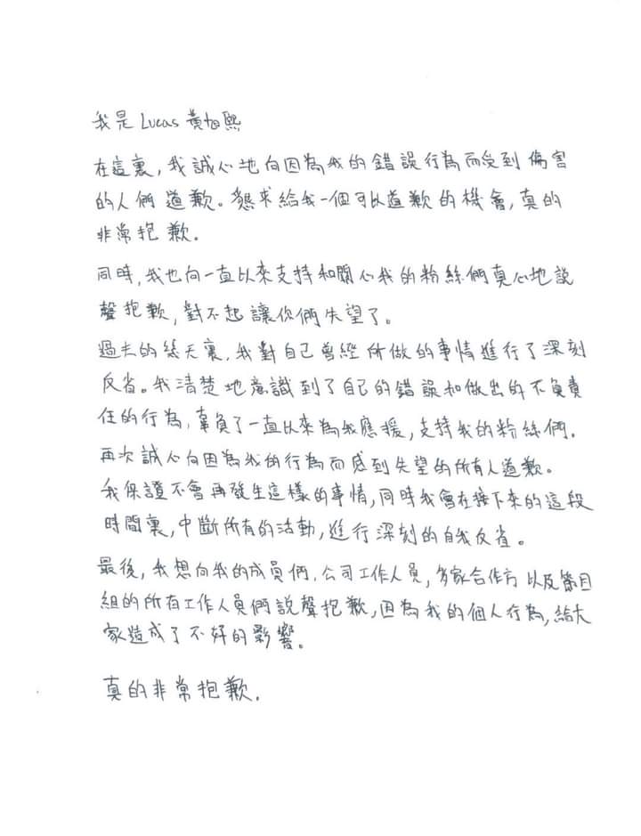 黄旭熙为近日传出的丑闻而发出手写信道歉,并表示会中断所有活动反省,原定他与Hendery黄冠亨组的小分队将在今日释出新歌MV也因此而中断,威神V官方平台将两人的头像宣传换走了。