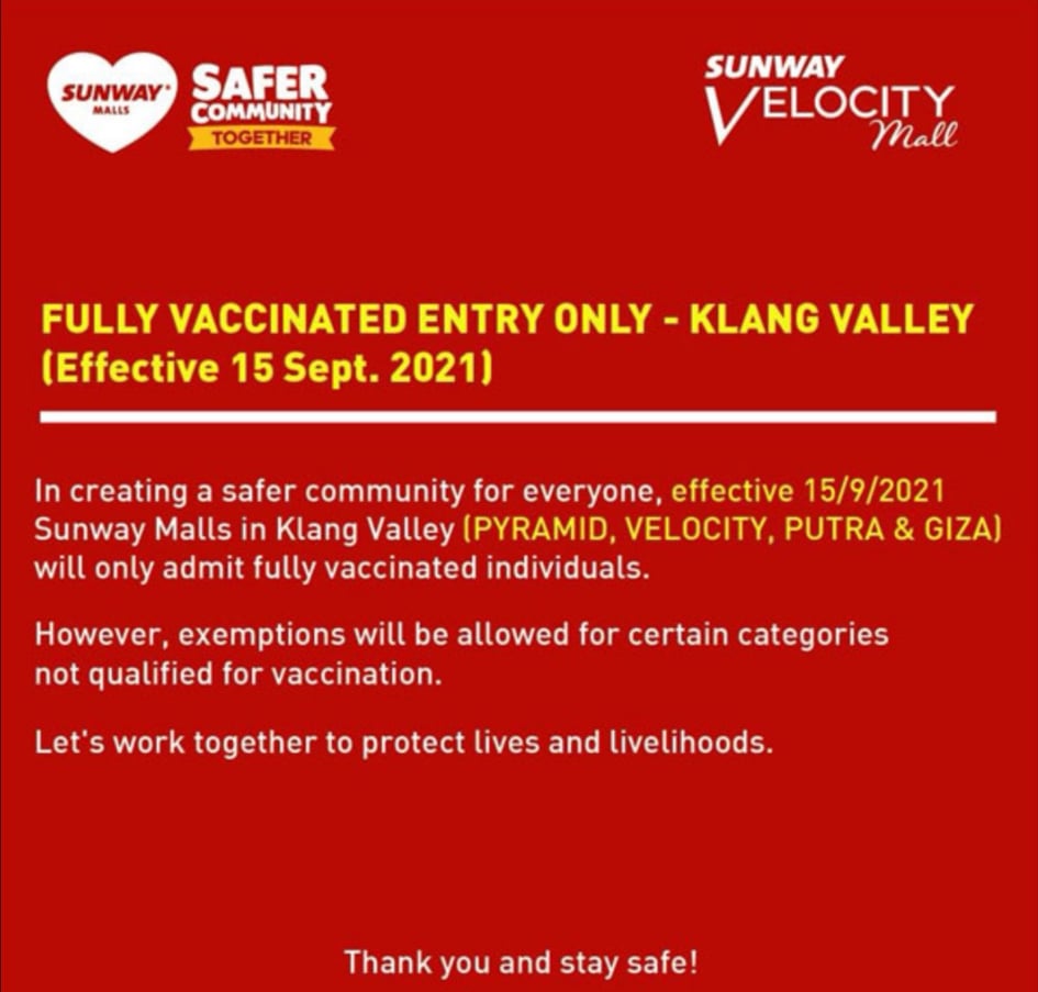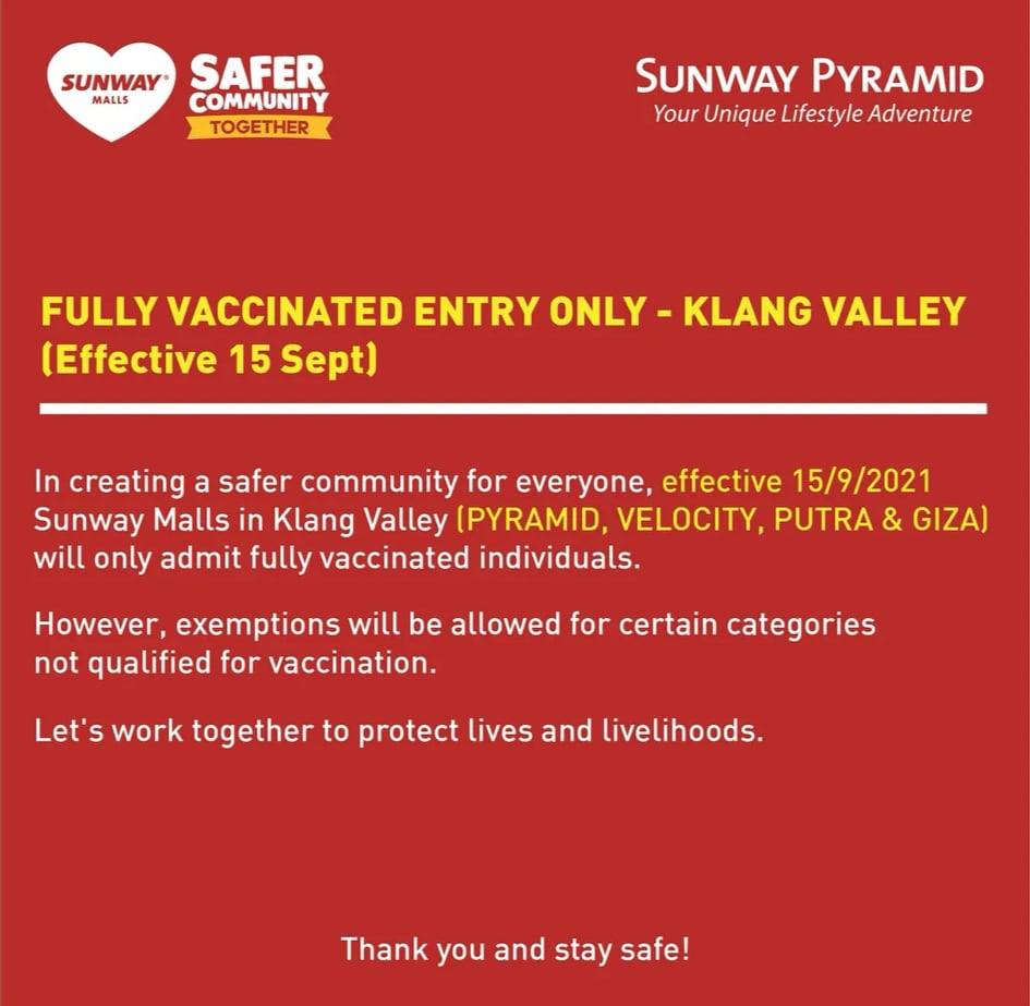 随着疫苗接种率已达群体免疫标准,雪隆区越来越多的购物商场宣布,未来仅允许完成接种新冠疫苗者进入,也就是说,未接种疫苗者禁止入内!这些购物商场,包括双威集团的:Sunway Pyramid、Sunway Velocity、Sunway Putra Mall、Sunway Giza!