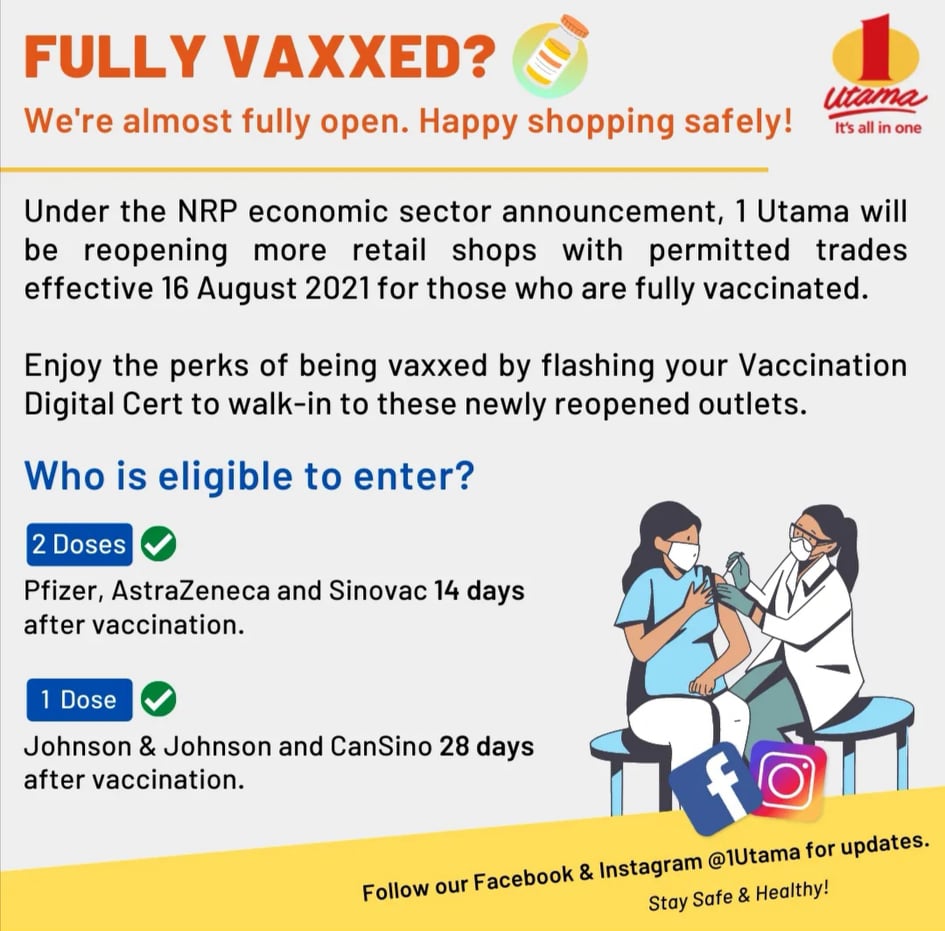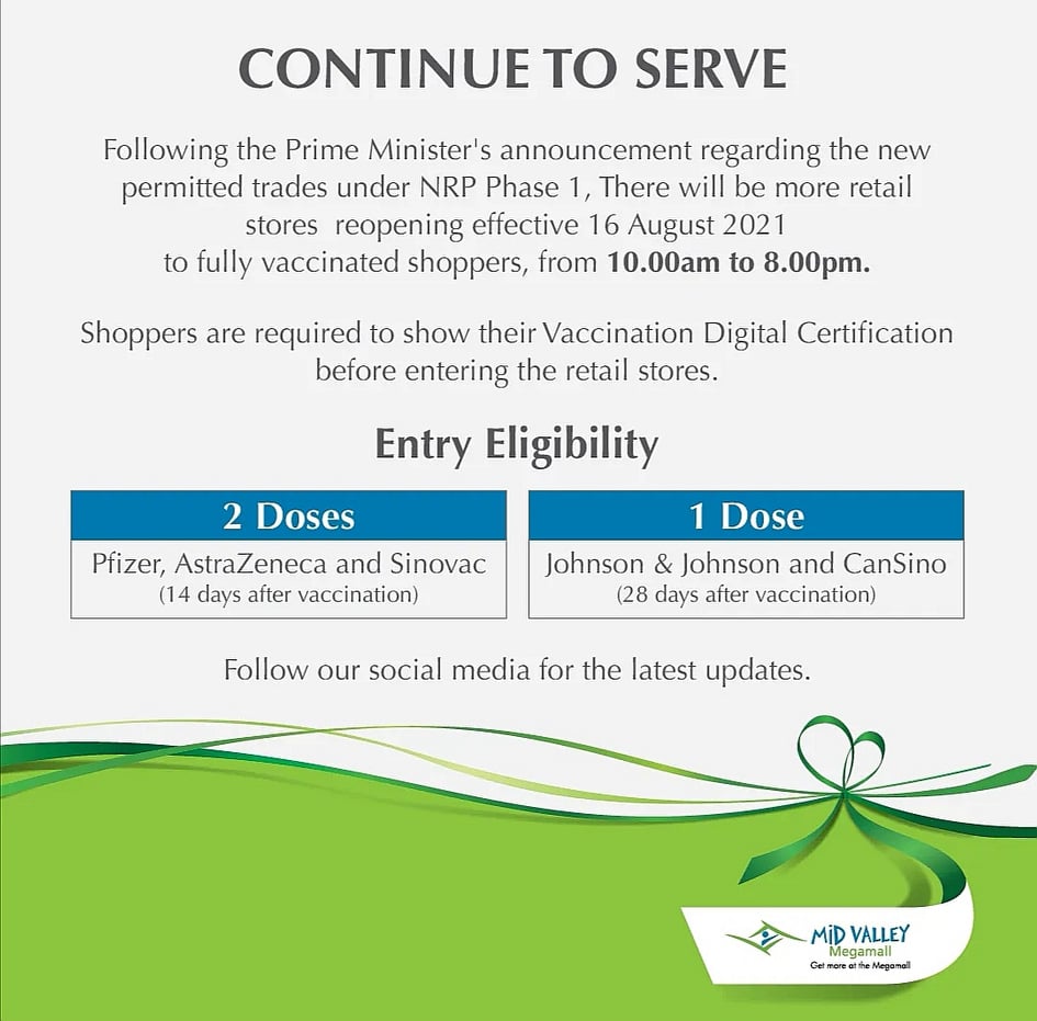 从9月15日开始,以上购物商场只允许完成疫苗接种者进入!此外,其他的购物商场像是Mid Valley、1 Utama、Suria KLCC、Fahrenheit Mall等,也同样在官方面子书公布,商场内的零售店已陆续恢复运作,并规定顾客需完成疫苗方可进入!