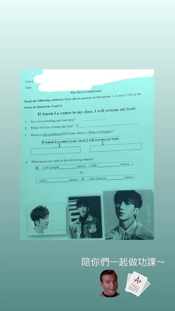 据港媒报道,有学校的英文科功课以“卢瀚霆”为题目,并配上多张卢瀚霆的照片,提及“If Anson Lo comes to my class, I will scream out loud.(假若卢瀚霆来我的班上,我会立刻尖叫)”。而卢瀚霆获悉后,日前亦在IG限时动态分享一张英文科功课,并配文写上“陪你们一起做功课”,怎料却引发家长不满,甚至质疑这份功课的老师是“神徒(粉丝昵称)”。