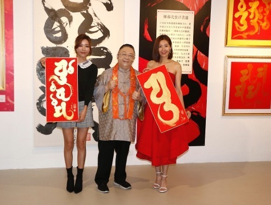 堪舆学家李居明昨(15日)在香港湾仔举行《李居明书道书法展》,请来艺人陈自瑶(YoYo)和赖慰玲做剪彩嘉宾,李大师送赠两幅书法给她们,送陈自瑶的书法代表财富,送赖慰玲的书法代表添丁,寓意会生够3个。