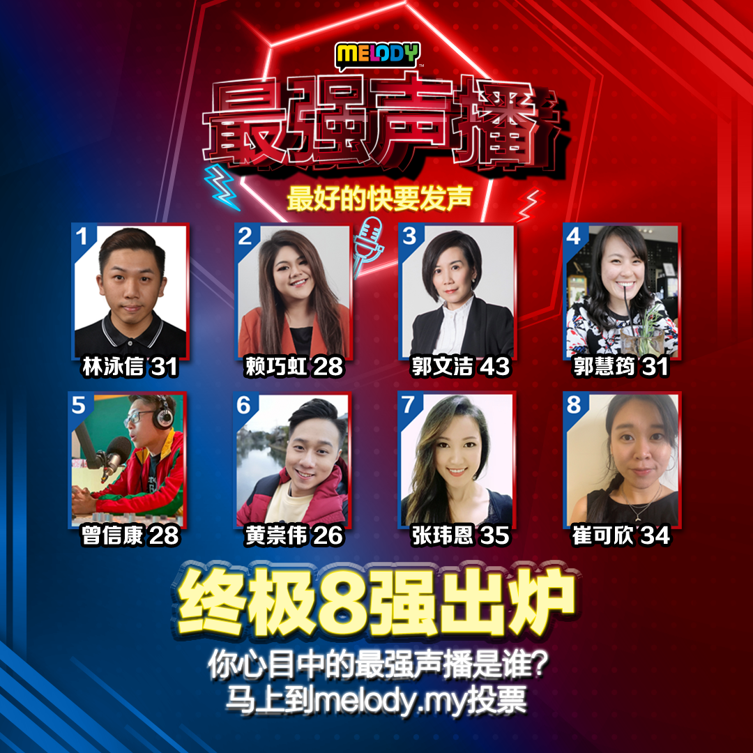 成功跻进《MELODY 最强声播》 8 强的参赛者有:林泳信(31岁)、赖巧虹(28 岁)、郭文洁(43 岁)、郭慧筠(31 岁)、Aaron 曾信康(28 岁)、黄崇伟(26 岁)、张玮恩(35 岁)和崔可欣(34 岁)。