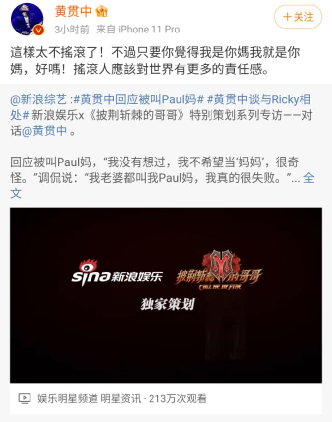 虽然他觉得被称像妈妈很不摇滚,不过老婆朱茵可不这么认为,还直接认证了老公的新称号,在微博留言也直接称老公是“Paul妈“,黄贯中笑说:”连我老婆也叫我Paul妈,我真的很失败!“,网友也被夫妻俩的互动给笑到,评论调侃”果然是亲老婆无疑“。
