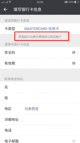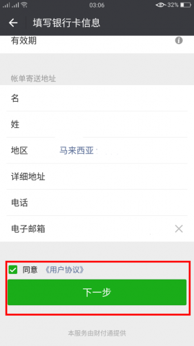 步骤6:填写银行卡信息并勾选同意后点击下一步(小编用的是大众银行的Debit Card的卡号,认证将会收取0.05美金【大概RM0.20左右】的验证费用哦!)