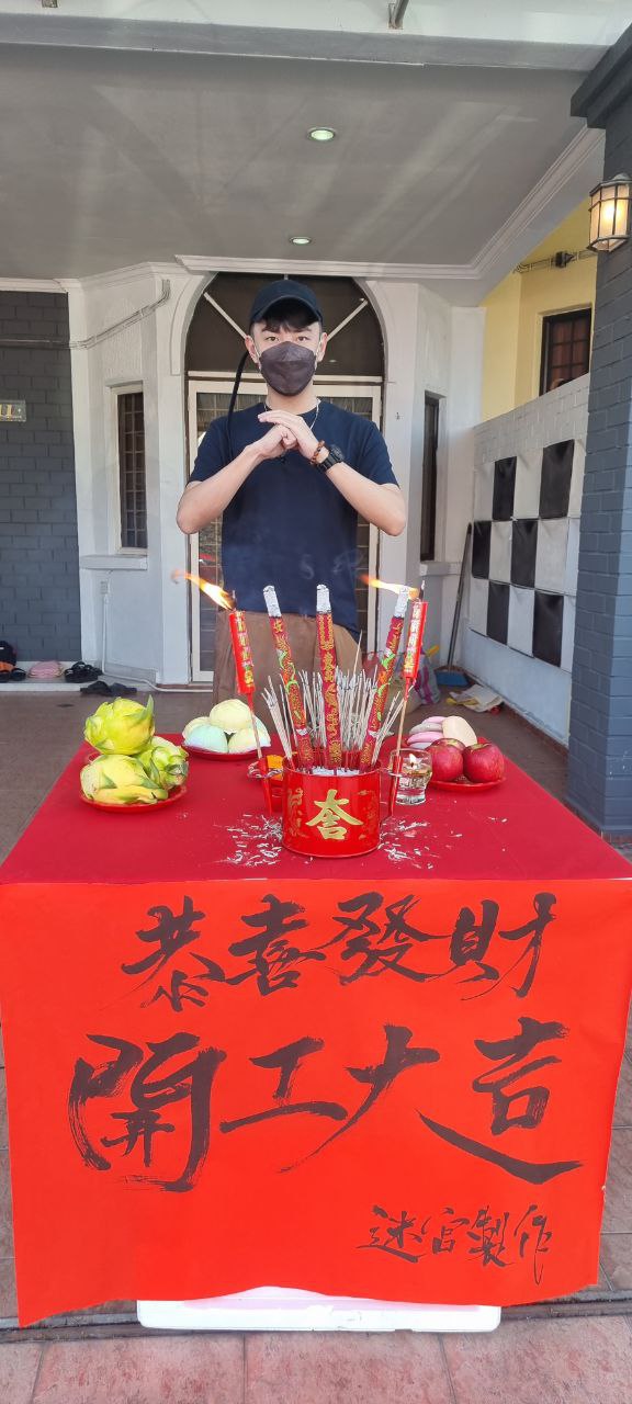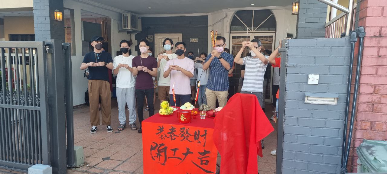左起Bernard森竣、Jordan盛天俊、Rickman谢承伟、Wilson李伟燊与剧组人员进行拜神仪式,祈求拍摄顺利。
