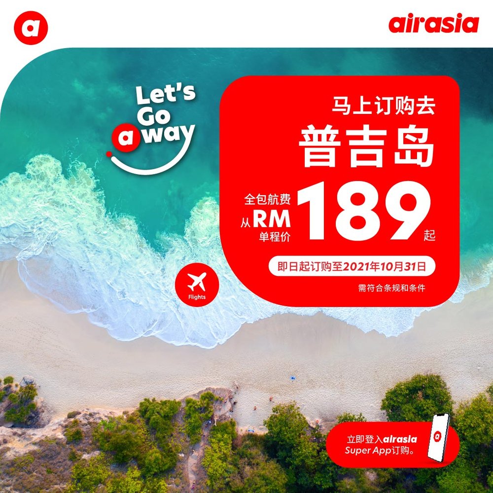 从即日起至10月31 日,客人只需以单程189令吉的价格,即可预订飞往普吉岛的航班。出发日期为11月5日至2022年3月30日。客人可以通过超级应用程序上的“SNAP”图标获得超值航班+酒店优惠,同期旅行只需549令吉起。喜欢单独预订酒店的客人可以查看应用程序中的’Hotel’图标并预订SHA Plus提供的普吉岛酒店,使用促销代码 #AAHOTEL10 可获得额外10% 的折扣。