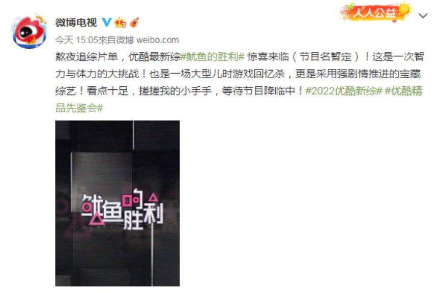优酷在招商会“精品先鉴会”上公开2022年即将制作及播出的节目和戏剧,其中一档名为《鱿鱼的胜利》的综艺节目,介绍词上写着:“智力、体力大挑战,儿时游戏回忆杀。”