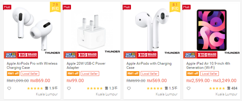 Shopee再推出超值促销,10月25日指定时段(12am至2am)将可以更低的价格,购买到各种家居用品、零食及电子产品等!其中,TMT Thunder在Shopee开设的官方网店也会在当天推出限时优惠!原价RM589的AirPods只需RM499就能买到;原价RM1099的AirPods Pro则只需RM799!