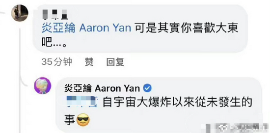 网友问“你喜欢大东吧”炎亚纶妙回14字 27 Oct , 2021 | 娱乐前线 有传炎亚纶自组合飞轮海开始就暗恋汪东城总总6年,而近日有网友直接留言问炎亚纶“你喜欢大东吧”,结果获得本尊亲自回复了! 有网友给炎亚纶留言:“可是其实你喜欢大东吧…”,意外获得炎亚纶本人回复:“自宇宙大爆炸以来从未发生过的事”,否认这一传闻。从字面上都能感觉到炎亚纶对于这段“绯闻”的无奈,既然本尊都否认了,大家就别再把他们扯到一起了。 分享