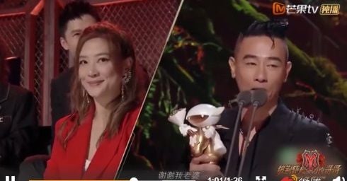 陈小春在发表得奖感言时,镜头带到了应采儿,只见她不断喊话要老公感谢自己,而他则慢慢述说自己的心路历程,最后才表示:“谢谢我老婆,谢谢我家里的两个儿子,也谢谢所有台前幕后为这个《披荆斩棘的哥哥》流过一滴汗的人。”应采儿才露出满意的表情,并大方送出飞吻,让原本感人的场面瞬间变得欢乐。
