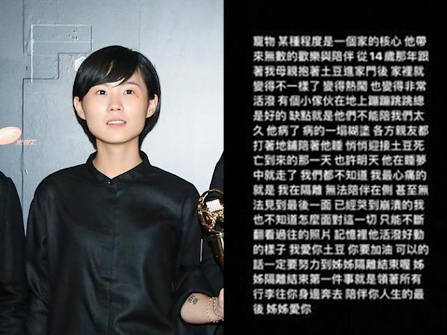有台媒报导指出,她在身亡前的15个小时曾在IG发文,提到从小陪伴她长大的14岁爱犬“土豆”生重病,随时可能会离世,但她因在防疫旅馆无法陪伴左右,因此感到自责。