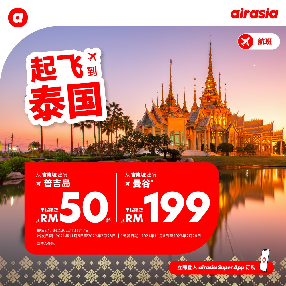 打算旅游泰国的朋友们注意啦!亚航公司将每周运营4次前往泰国的航班,从吉隆坡到曼谷(每周2次)和普吉(每周2次)!从即日起至11月7日,客人可以通过亚航超级应用程序上的“Flights”图标,订购从11月5日至2022年2月28日的单程至曼谷和普吉的航班,最低只需RM50!