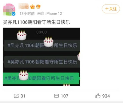 大批中国网民在微博送上另类的“祝福”,”#吴亦凡1106在北京朝阳看守所生日快乐”更是成为热搜,”祝你年年有今日!”、”生日快乐!奖励20年服刑期!‘’、‘’祝生日能吃一大碗宽面,大碗牢饭!‘’、‘’今日吴亦凡的生日礼物是不用被『爆菊』,他听到后一定开心得跳起来!‘’。