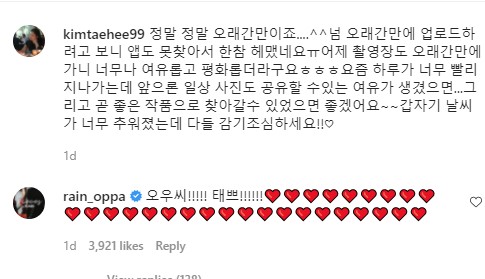 金泰希与Rain结婚5年,育有两名宝贝女儿,近日金泰希久违的在IG更新了美照,没想到老公Rain速速留言报到,大赞老婆“泰漂亮了”其后还疯狂打出多个“爱心”符号,真的是爱妻号无误!