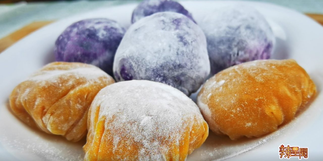 材料:春卷皮、紫薯、金瓜、牛奶、糖、糯米粉、酸奶