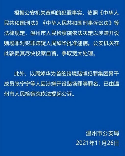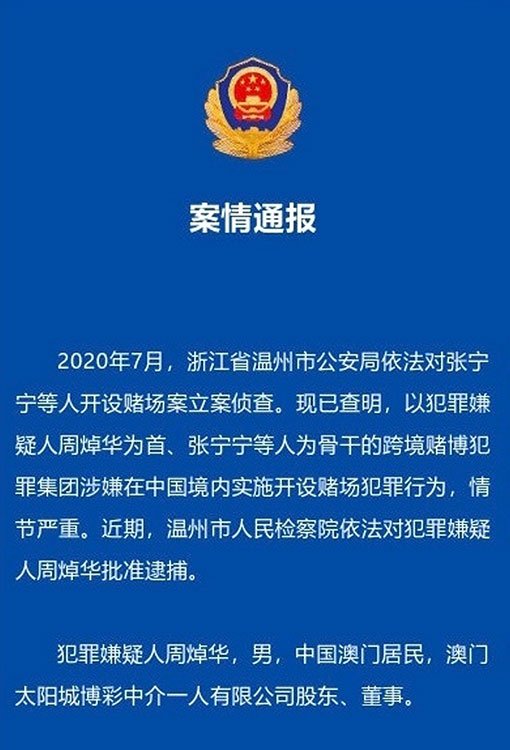 据港媒报导,周焯华2007年以来在澳门等地赌场承包赌厅,又于2016年在菲律宾等地开设网路赌博平台。
