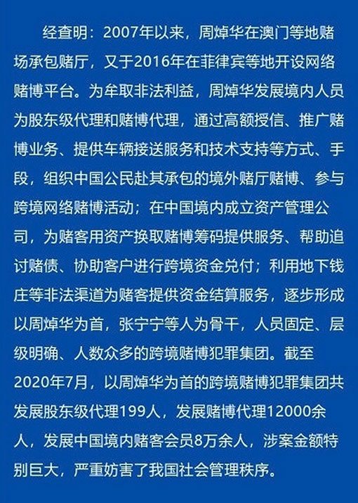 截至2020年7月,以周焯华为首的跨境赌博犯罪集团共发展股东级代理199人,发展赌博代理1.2万馀人,发展中国赌客会员8万馀人,涉案金额庞大。