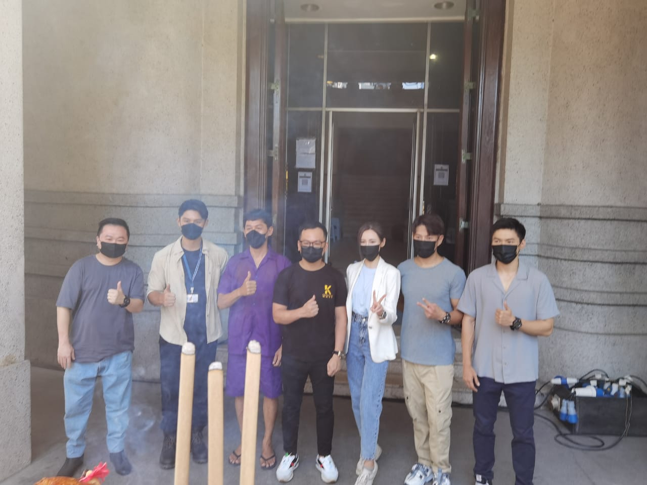 陈沛江(左3)出席开镜仪式,开拍短短三天就确诊新冠肺炎了。