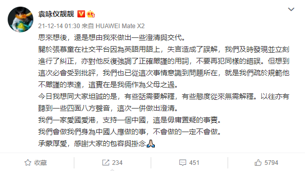 虽然只是一句话,就让大批中国网友不满的到袁咏仪微博大骂魔童用词不当,让袁咏仪漏液在微博发长文道歉:“思来想后,还是想由我来做出一些澄清与交代。关于张慕童在社交平台因为英语用语上,失言造成了误解,我们及时发现并立刻进行了纠正,亦对他反复强调了正确严谨的用词,不要再犯同样的错误。但想到这次必会受到批评,我们也已从这次事情意识到问题所在,就是我们疏于规范他不严谨的表达,这实在是我俩作为父母之过。