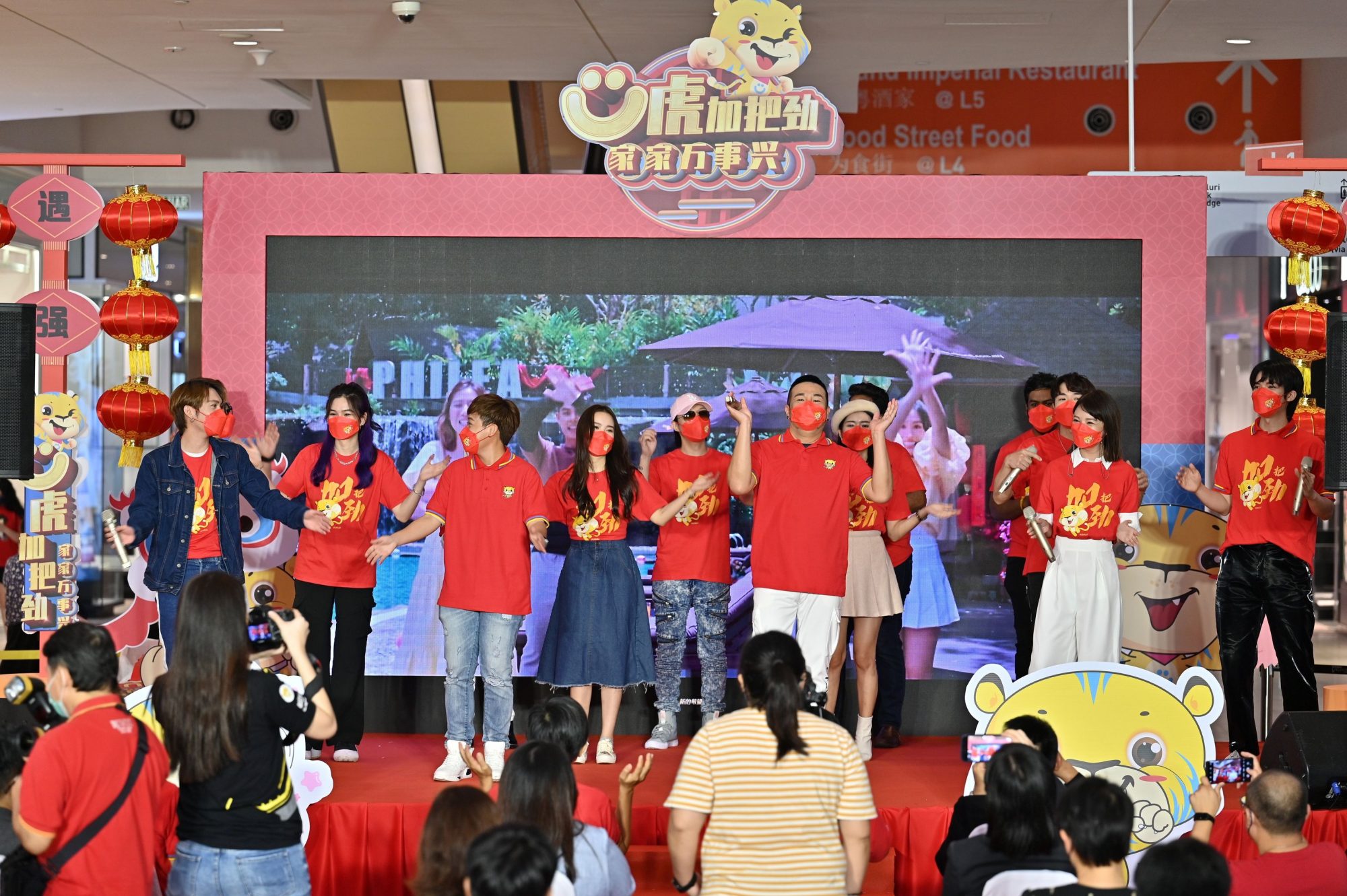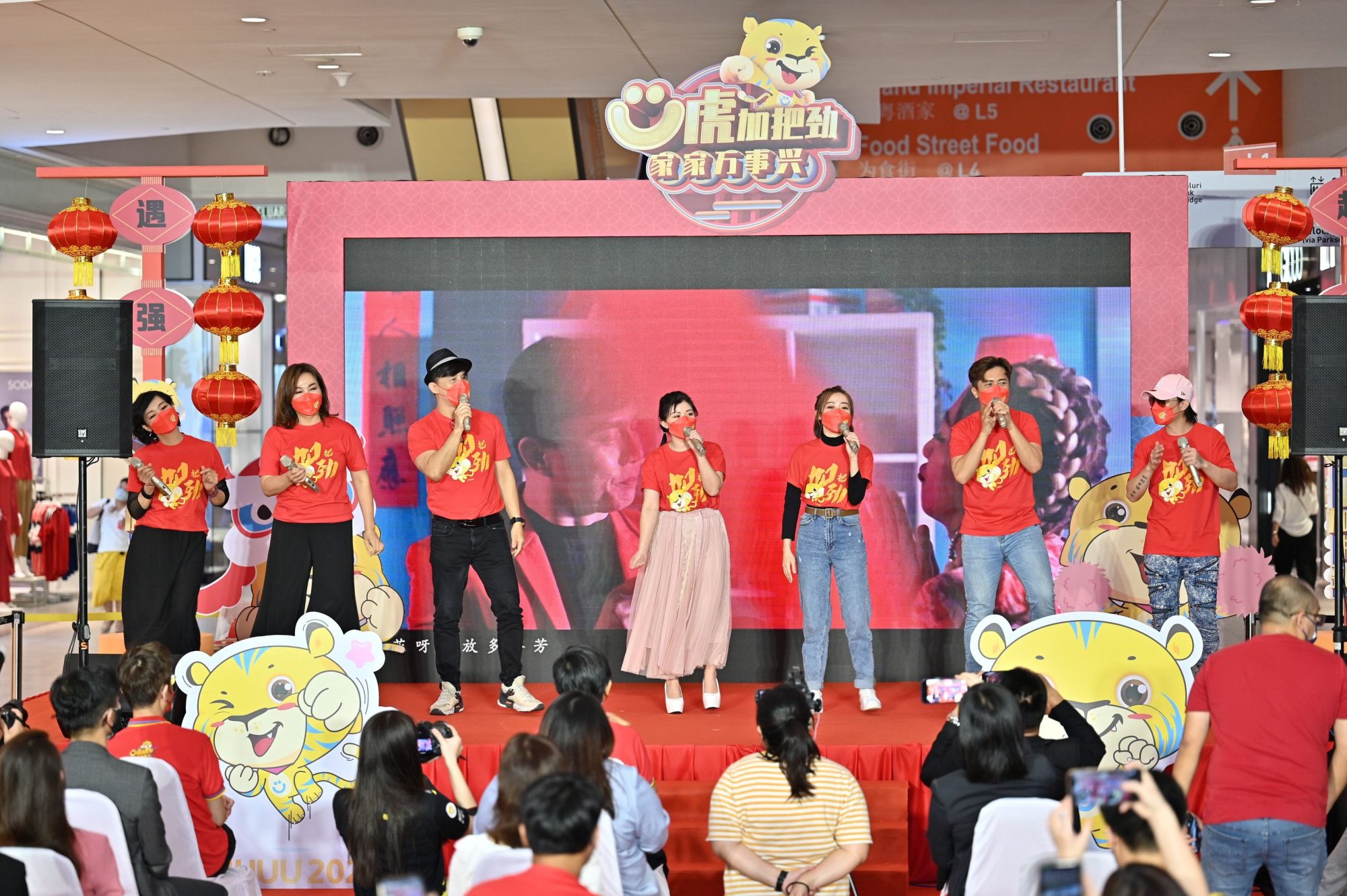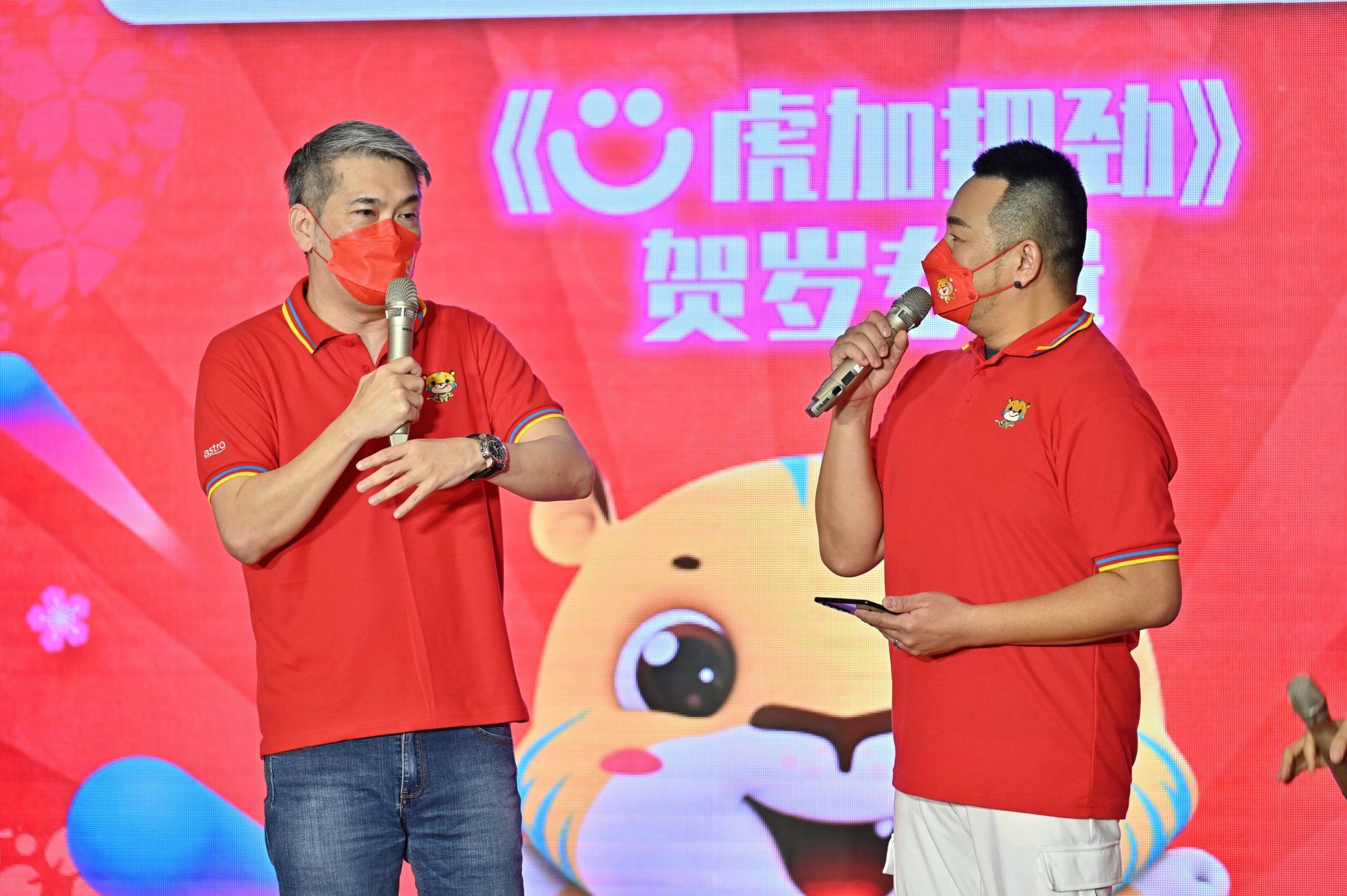 林德荣和林震前担任主持宣布新春活动,艺人歌手陆续上台演绎新年歌与接受访问,各自开心分享拍摄MV各种趣事。其中黄一飞(左2)为《虎你过好年》填词,他感触因为疫情让自己有许多情绪,甚至亲友离世,自己无法道别,他瞬间哽咽无法继续说下去,在转换心情后才续说:“希望这首歌传达出大家要珍惜团员,珍惜当下的讯息。”