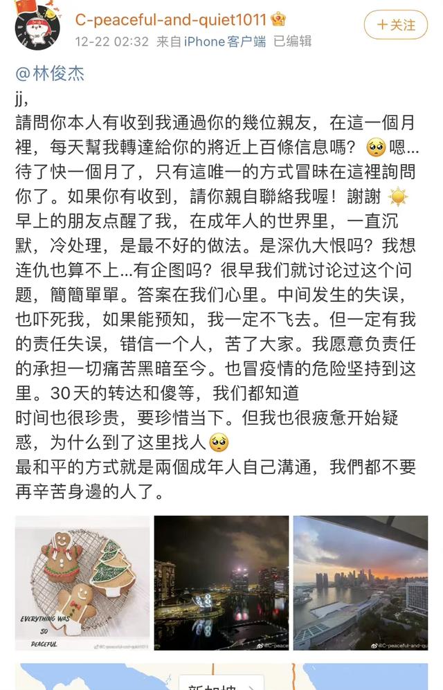 恰好微博有一名账号为“C-peaceful-and-quiet1011”的网民在微博公开标了林俊杰的官方账号,言语间透露人已在新加坡待了一个月,就是为了林俊杰给个说法,但中间无数次通过亲友给林俊杰发消息皆无回应,没办法才发微博,希望通过这方式和林俊杰取得联系,并喊话“是深仇大恨吗?我想连仇也算不上…有企图吗?很早我们就讨论过这个问题,简简单单。答案在我们心里。”
