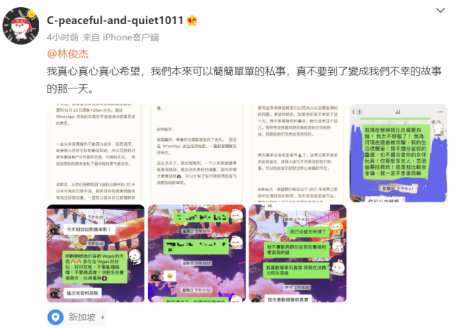 女网友再爆“暧昧对话记录” 林俊杰暂没回应 24 Dec , 2021 | 娱乐前线 早前有网友发文指控遭林俊杰冷暴力,随后林方大阵仗的发声明辟谣,不过该爆料女网友并没有因此而收手,继续晒出她与“林俊杰”的暧昧对话! 在林俊杰发出声明后,该女网友再次标记了林俊杰微博账号写:“我真心真心真心希望,我们本来可以简简单单的私事,真不要到了变成我们不幸故事的那一天”。 不过,从她晒出所谓的对话记录中,两人只是普通的聊天,并没有调情的情况。有眼尖的网友也质疑该对话记录是“做”出来的假象,指控爆料女网友做贼心虚把之前微博动态清空。截止到目前,林俊杰方面并没有回应过该女网友的一切言论。 分享