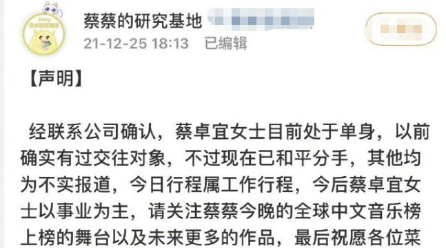 怎料,蔡卓宜的粉丝发文,声称在向公司确认后,她目前是单身,“以前确实有过交往对象,不过现在已和平分手”,被解读成宣告与王大陆分手,让人相当错愕。